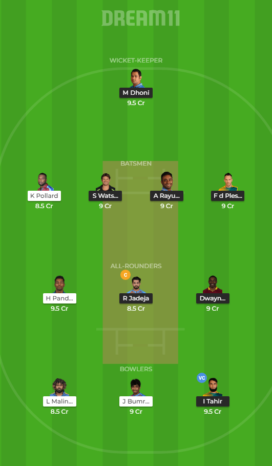Shane Watson, Faf du Plessis, Ambati Rayudu, Suresh Raina, Kedar Jadhav, MS Dhoni (C,WK), Ravindra Jadeja, Dwayne Bravo, Deepak Chahar, Harbhajan Singh, Imran Tahir.