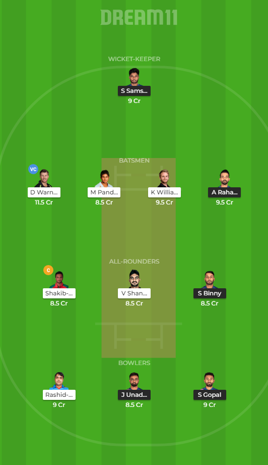 David Warner, Kane Williamson (C), Manish Pandey, Vijay Shankar, Wriddhiman Saha (wk), Mohammad Nabi/Shakib Al Hasan, Yusuf Pathan, Rashid Khan, Bhuvneshwar Kumar, Khaleel Ahmed, Sandeep Sharma.