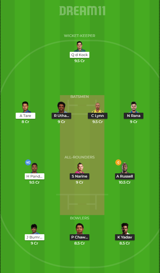 Rohit Sharma, Quinton de Kock, Evin Lewis, Kieron Pollard, Hardik Pandya, Krunal Pandya, Suryakumar Yadav, Anukul Roy / Mayank Markande, Rahul Chahar, Lasith Malinga, Jasprit Bumrah.