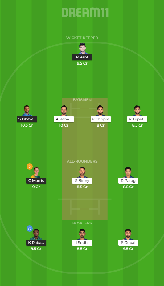 Prithvi Shaw, Shikhar Dhawan, Shreyas Iyer (c), Rishabh Pant (wk), Colin Ingram, Sherfane Rutherford, Chris Morris, Axar Patel, Amit Mishra, Trent Boult, Jagadeesha Suchith