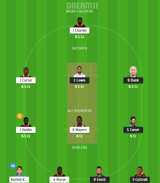 Sohail Tanvir, Evin Lewis, Chris Lynn, Denesh Ramdin (wk), Jon-Russ Jaggesar, Sheldon Cottrell, Dominic Drakes, Rayad Emrit (c), Alzarri Joseph, Ish Sodhi, Joshua Da Silva, Ben Dunk (wk), Colin Archibald, Nick Kelly, Jahmar Hamilton, Imran Khan.